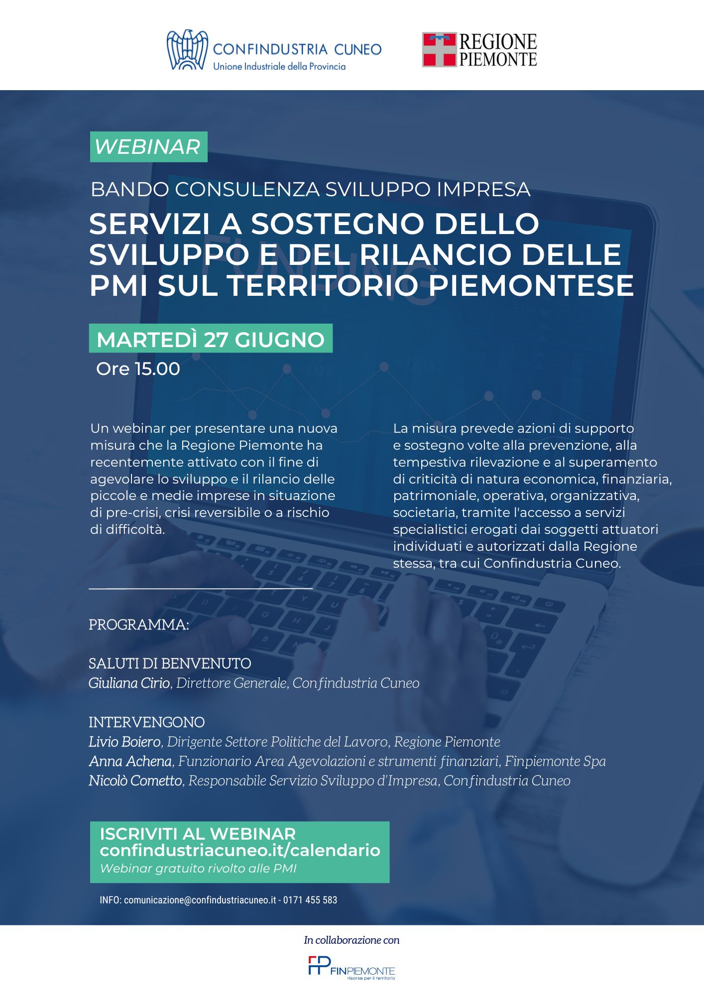 Martedì 27 giugno, alle ore 15.00, Confindustria Cuneo, uno dei soggetti attuatori individuati da apposito bando regionale, in collaborazione con noi e Regione Piemonte, organizza un webinar per presentare la nuova misura Consulenza Sviluppo Impresa - Servizi a sostegno dello sviluppo e del rilancio delle imprese PMI sul territorio piemontese che la Regione Piemonte ha recentemente attivato con il fine di agevolare lo sviluppo e il rilancio delle piccole e medie imprese in situazione di pre-crisi, crisi reversibile o a rischio di difficoltà.