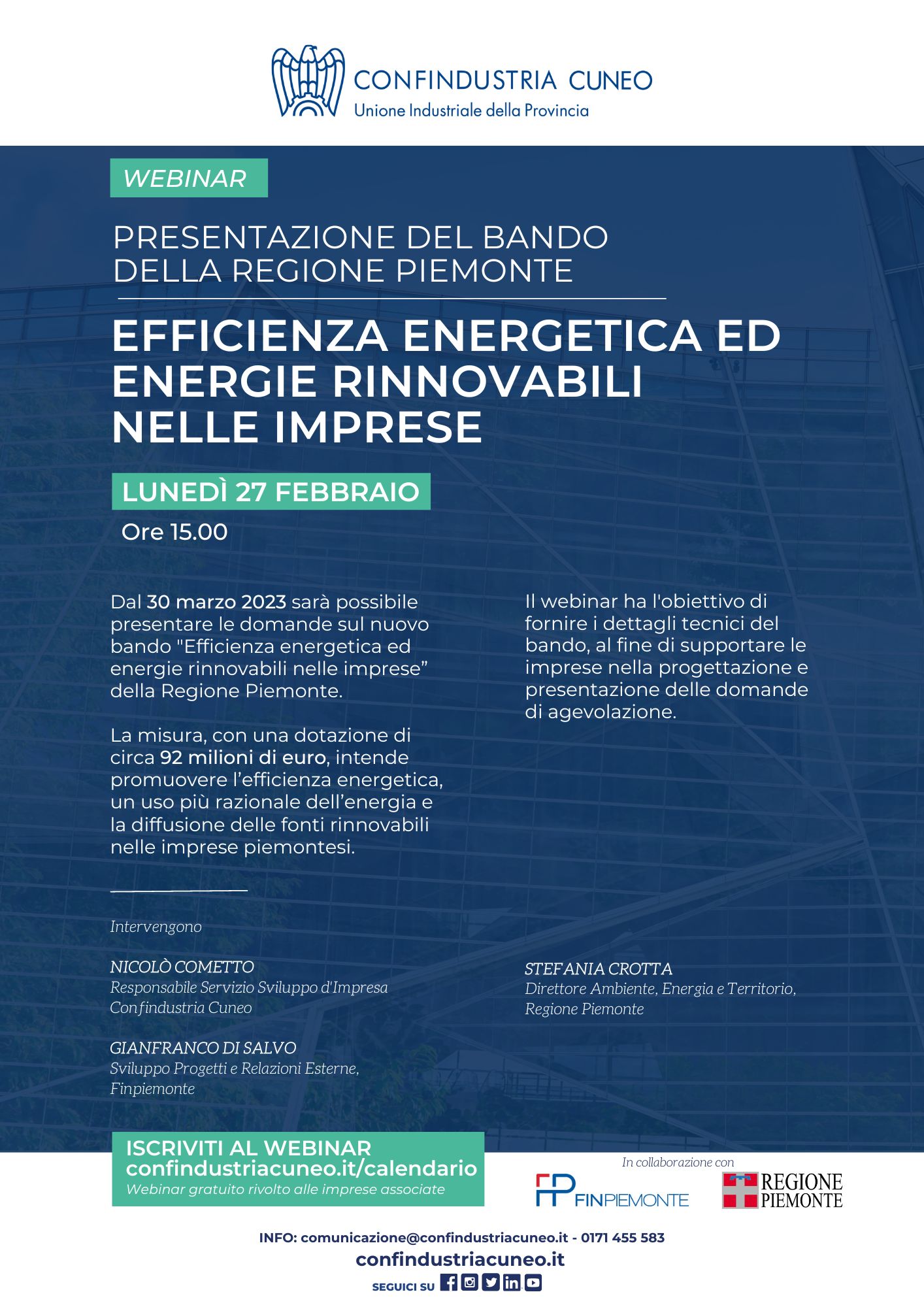 Lunedì 27 febbraio 2023 alle 15.00, insieme a Regione Piemonte, interverremo al webinar tecnico dedicato alle imprese associate a Confindustria Cuneo, relativo al nuovo bando “Efficienza energetica ed energie rinnovabili nelle imprese”.